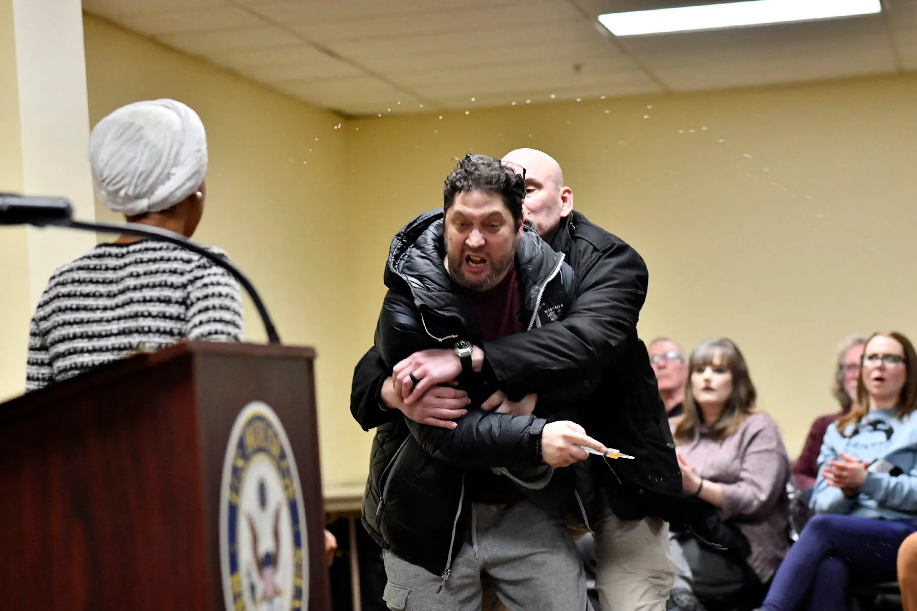 Omar later told authorities that the substance stained her clothing and may have reached her face and right eye, raising immediate concerns about possible chemical exposure. Security personnel and law enforcement quickly intervened, detaining Kazmierczak at the scene.